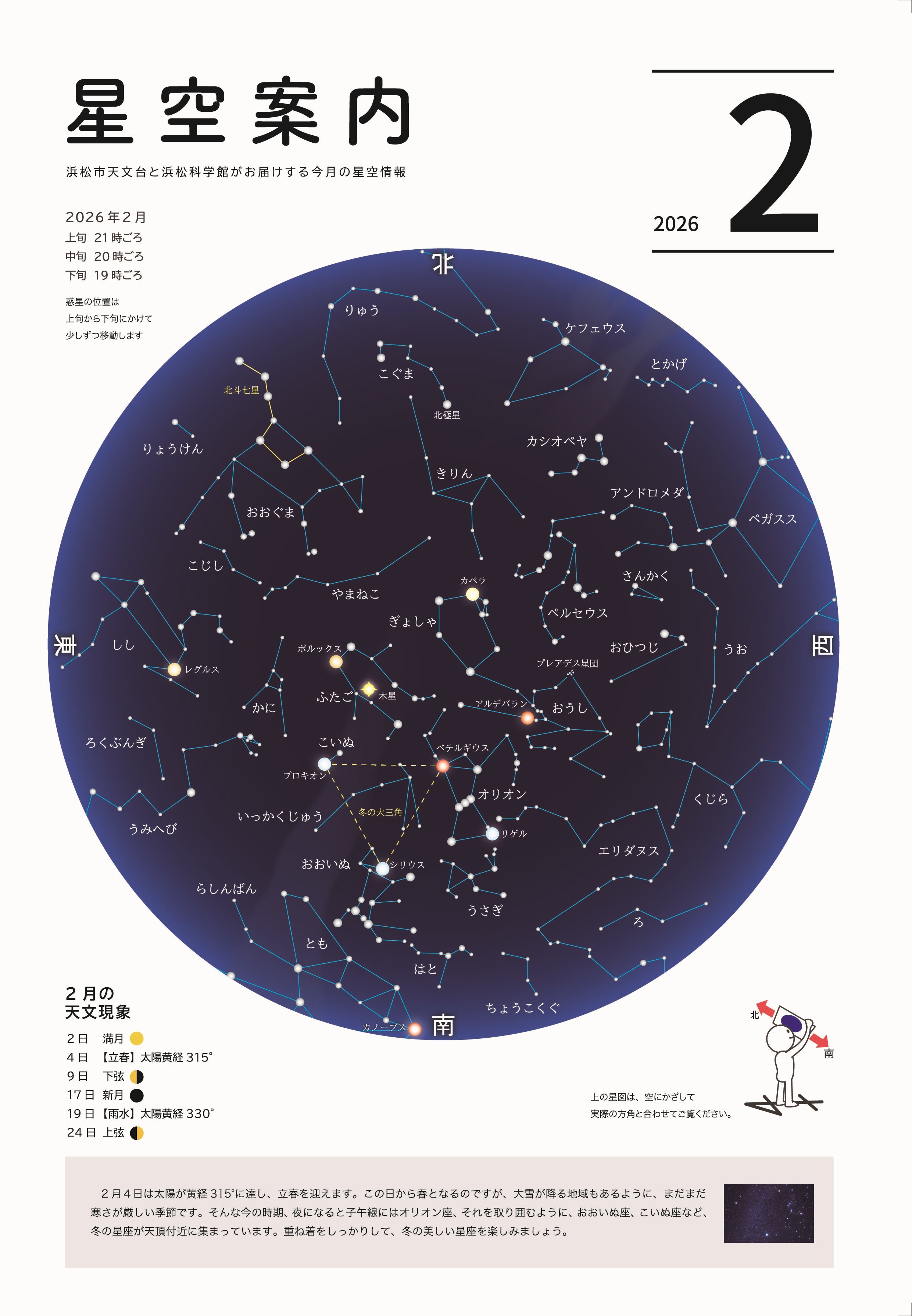 2月4日は太陽が黄経315°に達し、立春を迎えます。この日から春となるのですが、大雪が降る地域もあるように、まだまだ寒さが厳しい季節です。寒さが厳しい夜ですが、子午線にはオリオン座、それを取り囲むように、おおいぬ座、こいぬ座など、冬の星座が天頂付近に集まっています。木星の輝きも美しく、星空観望会に参加された皆さんから、「縞模様がきれいだった。」や「明るくて、驚いた。」など様々な感想をいただきます。冬の美しい星空を、重ね着をしっかりして楽しみましょう。