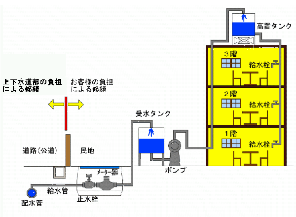 ご家庭の給水管と、これに取付けてある止水栓やじゃ口などはお客様の施設です(ただし、メーター器は上下水道部の所有)。