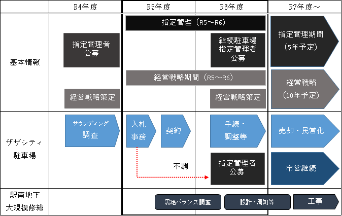 中長期的な駐車場経営に向けた「地固め」期間として、大きく駐車場事業の収支に影響するザザシティ駐車場の売却、駅南地下駐車場の機械式駐車設備の扱いや一時閉鎖が必要となる大規模修繕など中長期的な駐車場運営体制を早期に構築し、次期計画に反映するため、2年間の計画として取り組む。