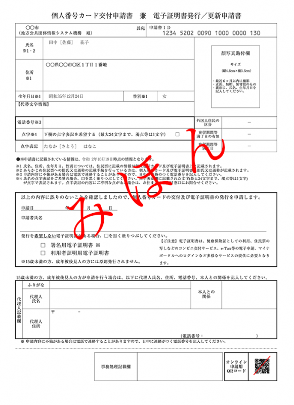 個人番号カード交付申請書の見本はこちら→交付申請書(見本1(PNG:218KB)/見本2(PNG:295KB))