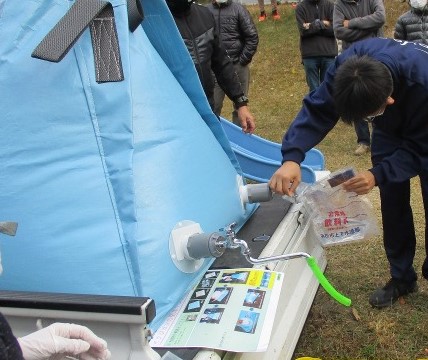 応急給水所では、給水車がずっと待機して水を配るのではなく、市民の皆様には、応急給水所内の水槽から、直接、各自で給水を受けていただきます。(給水車は複数の給水所を巡回して各給水所の水槽に給水します。)なお、浄水場は、給水車への補水のための重要拠点となるため、浄水場での市民の皆様への水の配布は行いません。