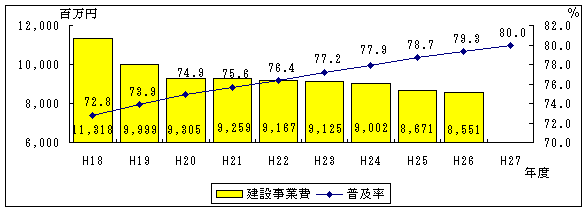 平成27年度末の下水道人口普及率80%の達成を目標に管きょ整備を推進するとともに、合流式下水道改善事業や老朽施設の改築更新などの施設整備事業を盛り込む一方、企業債残高の削減のため、各年度の建設事業費を毎年度、前年度を下回る額とすることを目標に算出した。 |