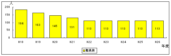 職員数は、ポンプ場など施設の維持管理業務の委託化や業務の見直しに伴う削減を見込み、平成18年度の183人に対し、平成26年度を113人とした。また、退職給与金は、各年度の見込退職者数により所要額を算出した。 |