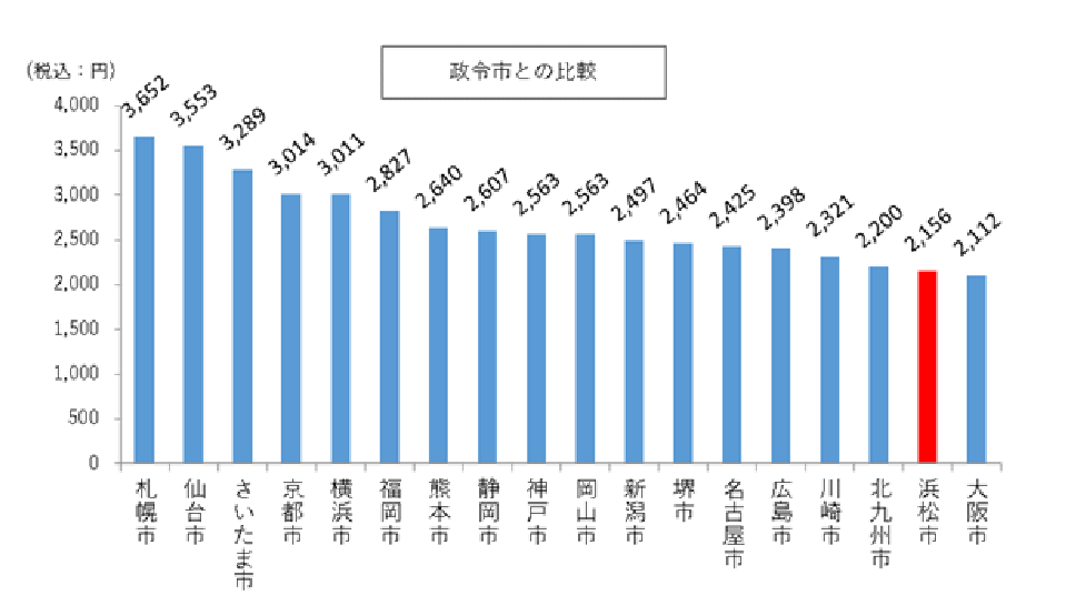 - 浜松市の水道料金は、2022(令和4)年度決算時点で政令指定都市18市※の中で2番目・近隣市町の中で最も安い水準になっています。※県営水道を主体とする千葉市と相模原市を除く