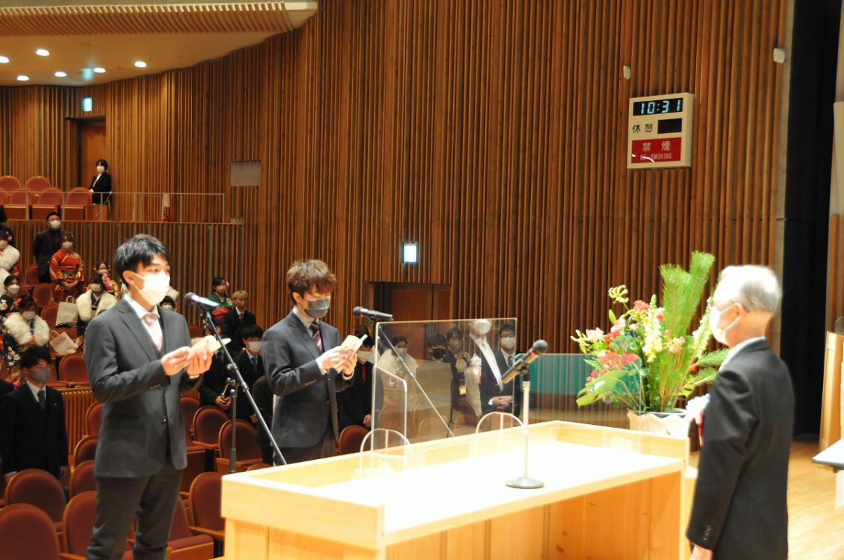 式典では、二橋岳之さんと黒川登生さんが新成人代表の誓いの言葉として、「一日一日を大切にして、刻々と変化していく社会の中で柔軟に困難を乗り越えて生きていきたいと思います」と力強く語り気持ちを新たにしていました。