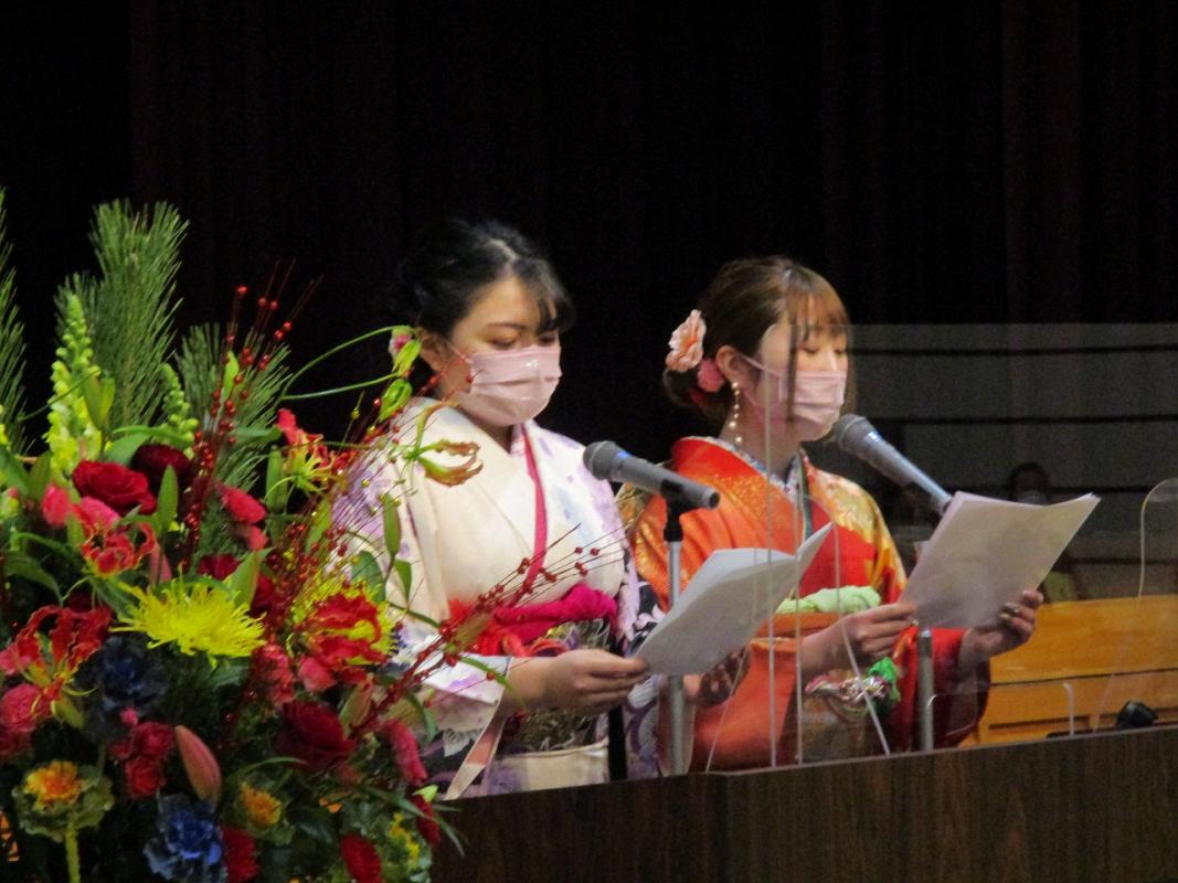 新成人を代表し、市川桃花さんと松山穂香さんが「大好きな仲間とともにふるさと春野で成人式を迎えることができ、喜びと感謝の気持ちでいっぱいです。これからの人生、困難にも立ち向かいながら、自分の夢や目標のために歩み続けていきます。」と誓いの言葉を述べました。