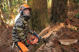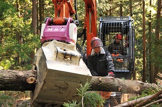 森下家の山でも一番古い山、樹齢120~130年の木が並ぶ山の伐採現場。まずは間伐する木を見極め、林道に搬出しやすいように木を倒す方向を決めます。伐採する木と支柱にする木をワイヤーロープでつなぐことで、重力に逆らって山頂方向に倒すことも可能です。そしてチェーンソーを使っての伐採が始まります。原付と同程度のエンジンを持つ大径材用のチェーンソーは重量があり、急斜面で扱うには技術と体力が必要です。10年扱っている広樹さんでも、完璧にきれいに伐採できるのは10本に6~7本だとか。木が倒れる瞬間、静かだった山の中に轟音が響き渡ります。切り倒した材はザウルスという丸太をつかむ機械で林道に吊り上げ、その場で業者に卸す長さに切り分けます。「これが間伐の一連の流れです」と森下親子が息の合った共同作業でトントンと実演してくれました。