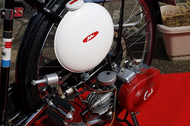 終戦後間も無い頃、本田宗一郎氏の奥さんが自転車で遠くまで買い物にいく苦労する姿をみて、放置されていた陸軍の無線機のエンジンを自転車に取り付け、補助動力としたところからこの原型が作られ、その後全国へ向けて販売するために改良が重ねられカブF型が完成しました。