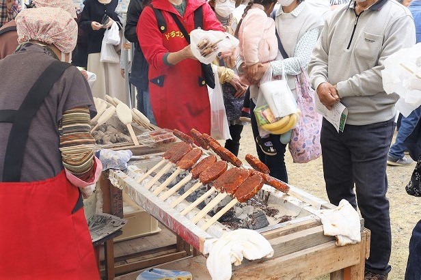 ▲NPO法人ほっと龍山ブース。瀬尻の赤芽イモの味噌焼き。赤芽イモとは里芋の一種です。里芋特有のぬめりが全くなくしっかりとした肉質が特徴で、濃厚なみそをつけて焼きます。