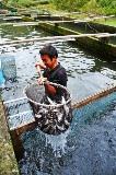 水槽の中に入り、あまごを見せてくれるという奥野さん。腰ほどの深さの水槽を網でひとすくいすると、あまごの大群がバシャバシャと威勢良く姿を現した。この元気のよい魚たちは、奥野さんの日々の努力の結晶だ。こちらもその姿をしっかりと収めようと、カメラのシャッターを切った。