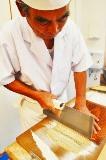 あっという間に、今まで目の前に延ばされていたそばがきれいに畳まれて、切り板(まな板)の上に。引き続き素早い作業が進みます。細く均一に、そしてリズミカルに。そう、運動会で徒競争のときに流れるあのBGMが、今にも聞こえてきそうです。