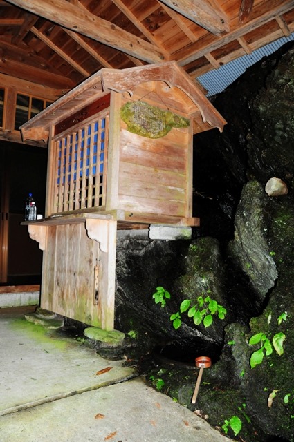 天竜区西藤平にある西来院。本堂の向かって左側の石段を下っていったところに小さく構えられた社がある。その横の岩から水が湧き出しおり、くぼみには水が溜められていた。