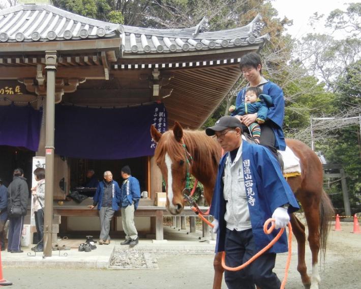約1200年前より馬頭観世音菩薩像が西鴨江の地に祀られ、広く地域の信仰を集めてきた西見寺。初午は徳川家康が三方ヶ原の戦いのときに武運と馬の健康をこの観音に祈願したと言われています。その後農耕馬が集まって厄落としをし、あわせて子供の健やかな成長を祈願しました。毎年3月の第1土・日曜日に開催される大祭では、絵馬に願いを託す人や、子供を馬に乗せ、観音堂の周りを回り、健やかな成長を祈願しています。