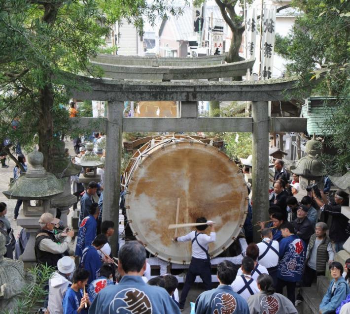 旧暦の9月14日・15日の満月の日に、町内安全と豊漁を祈願して「舞阪大太鼓まつり」が開催されます。岐佐神社の祭礼で、神輿の渡御とともに大太鼓、屋台が町内を練り歩き、400年以上に渡る歴史を持つ遠州の奇祭です。現在、直径7尺8寸(約236cm)の太鼓が最大。大きさに比例して音は地の底から響くような迫力があり、祭礼の代名詞にもなっています。