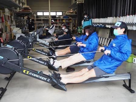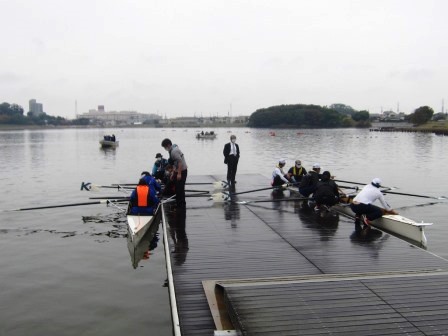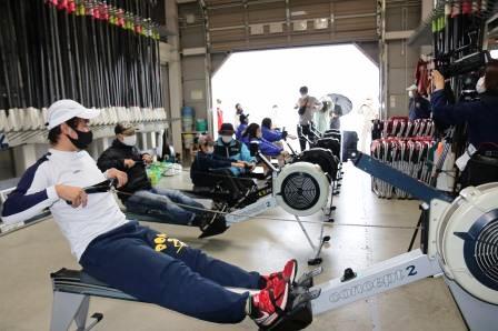参加者は、陸上で、ボートを漕ぐ動作を再現できる専用機具で漕ぎ方を教わった後、桟橋で競技用ボートに乗り込み、スタッフから手本を見せてもらいながら、一緒に湖面へと漕ぎ出して行きました。