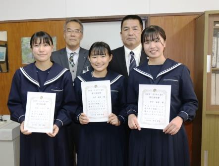 善行奨励賞を受賞された、浜松市立神久呂中学3年、笹竹さん、久野さん、池谷さん(写真右から)
