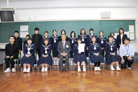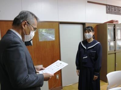 「青少年の表彰」は、昭和45年から始まり、今年で51回目となる歴史ある表彰制度です。受賞された皆さんは、学校の仲間のために、学校のために、さらには地域のために、どのようなことが必要かを考え活動されました。今回の受賞を大変嬉しく思っています。皆さんは、それぞれの家庭、仲間、学校の先生、地域の皆さん、社会の様々な人に支えられ見守られて成長してきたと思います。今回の表彰を自身の力として、自分を大切にしながらも、他の人たちにできることはないか、社会のためにできることはないか考えて、できることは一つ一つ実践していってほしいと願っています。これから一日一日を大切にしながら頑張ってください。