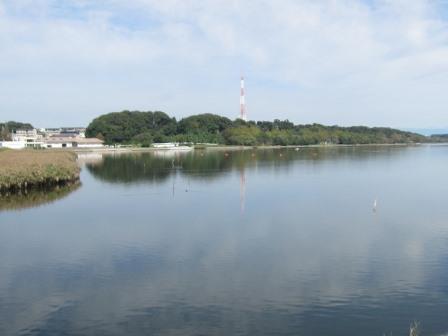 佐鳴湖へ注ぐ、段子川(富塚地区、奥に見えるのは佐鳴湖)。