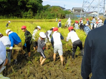 鎌の扱いに気を付けながら、稲を刈り取っていきます。収穫を実感する、うれしいひとときです!
