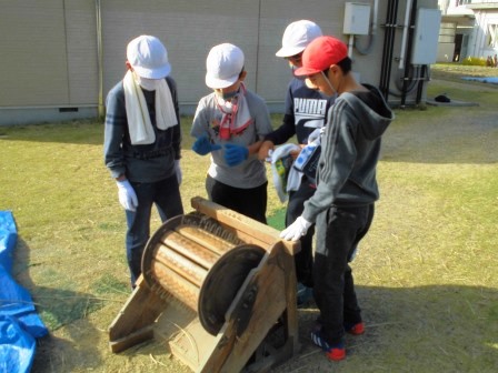 「足踏み脱穀機」という専用の道具を使って、脱穀していきます。