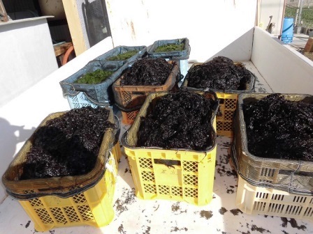 獲れたての生海苔です。いかにも海藻という感じで新鮮です。種類によって青海苔と黒海苔があり、これらを混ぜ合わせたものが「混ぜ海苔(舞阪では「ぶち海苔」と言います。)」となります。