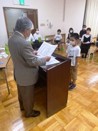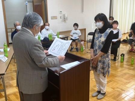 総会の中で、図書コーナーとコミュニティ文庫の読書大賞の授与式が行われ、児童の部の対象者3人に表彰状と記念品が授与されました。