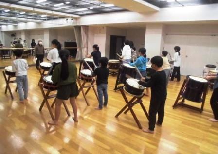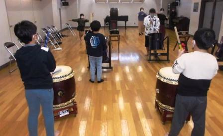 KAIKO500の皆さんが小学生(受講生)と一緒に和太鼓を叩いています。その保護者も一緒になって花を添えています。