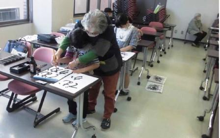 筆の持ち方から字体まで一人ひとりに細かく指導します。みんな味のある字にぞっこんです。