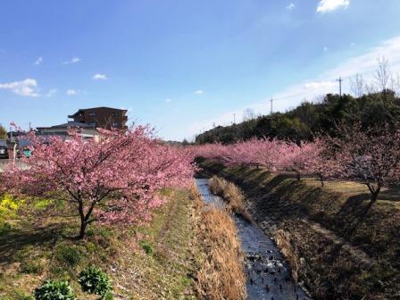 10数年前はタヌキ、野ウサギが住み着く荒地となっていましたが、東大山地区の人たちが中心となり、環境保全を行うグループの人たちの手により、荒れ果てた花川の堤防沿いを草刈機、チェーンソー、のこぎりなどを使い整備し、14年前、花川沿いと休耕田の法面に約400本の河津桜、150本の染井吉野の苗木を植えて、草刈り、消毒、施肥などの管理がされています。平成27年、樹高がいずれも2メートル以上に成長し、つぼみをたくさんつけたのを機に、毎年、「東大山河津さくらまつり」を桜の咲く2月中旬から3月初旬にかけて開催してきました。昨年は新型コロナの感染防止のためお祭りは縮小され、今年も同様となる予定です。