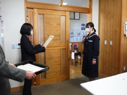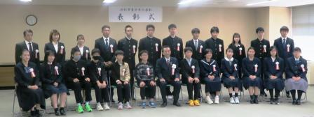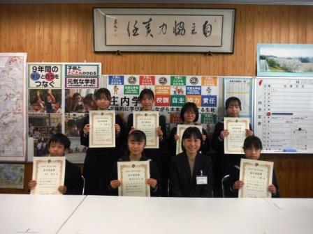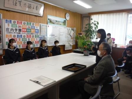 12月8日、善行奨励賞受賞の庄内学園(庄内中学校)の皆さんが、庄内学園にて区長から表彰を受けました。今回表彰された皆さんは、地元で開催された市民スポーツ祭トライアスロン大会に出場する選手が力を発揮できるよう大会運営に取り組むだけでなく、明るく爽やかに活動に励み、地域の活性化にも貢献しました。