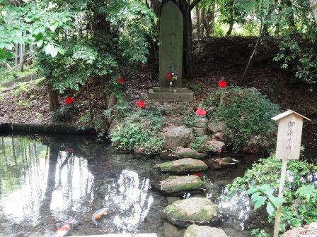 水出観音の先には鯉が泳ぐ池があり、石碑が建てられています。周辺の林が風に揺られて、水の音を聞きながら鯉が泳ぐのを眺められる癒しのスポットです。(※夏季は防虫スプレーをお持ちいただくことをお勧めします。)