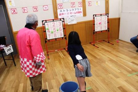ホールでは、ストラックアウト、射的、輪投げ及びはまゆう図書館による本立て作りを行いました。