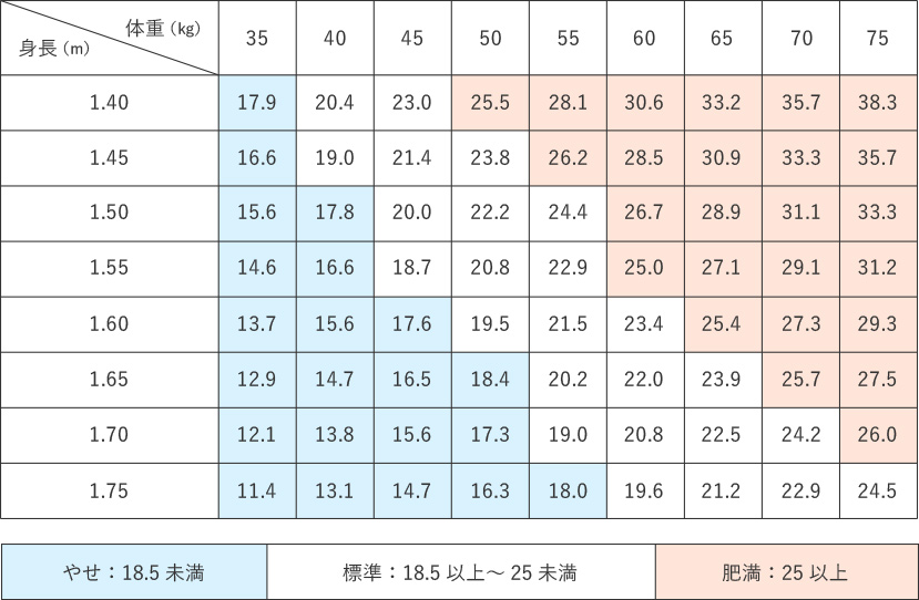 標準体重とはBMIが22になるときの体重で、最も病気になりにくい状態であるとされています。