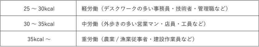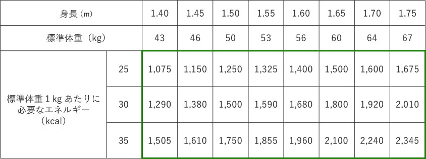 太枠内が1日に必要なエネルギー(キロカロリー)を示します。
