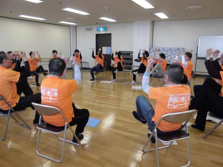 浜松市リハビリテーション病院で養成された「市民いきいきトレーナー」が、地域のシニア世代の集まり(シニアクラブ、サロン等)に出向き、運動機能の維持・向上を目的とした「浜松いきいき体操」の指導を行います。