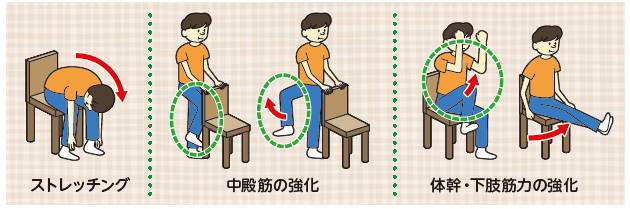 転倒予防に重要な筋力のトレーニング、体幹トレーニングなど