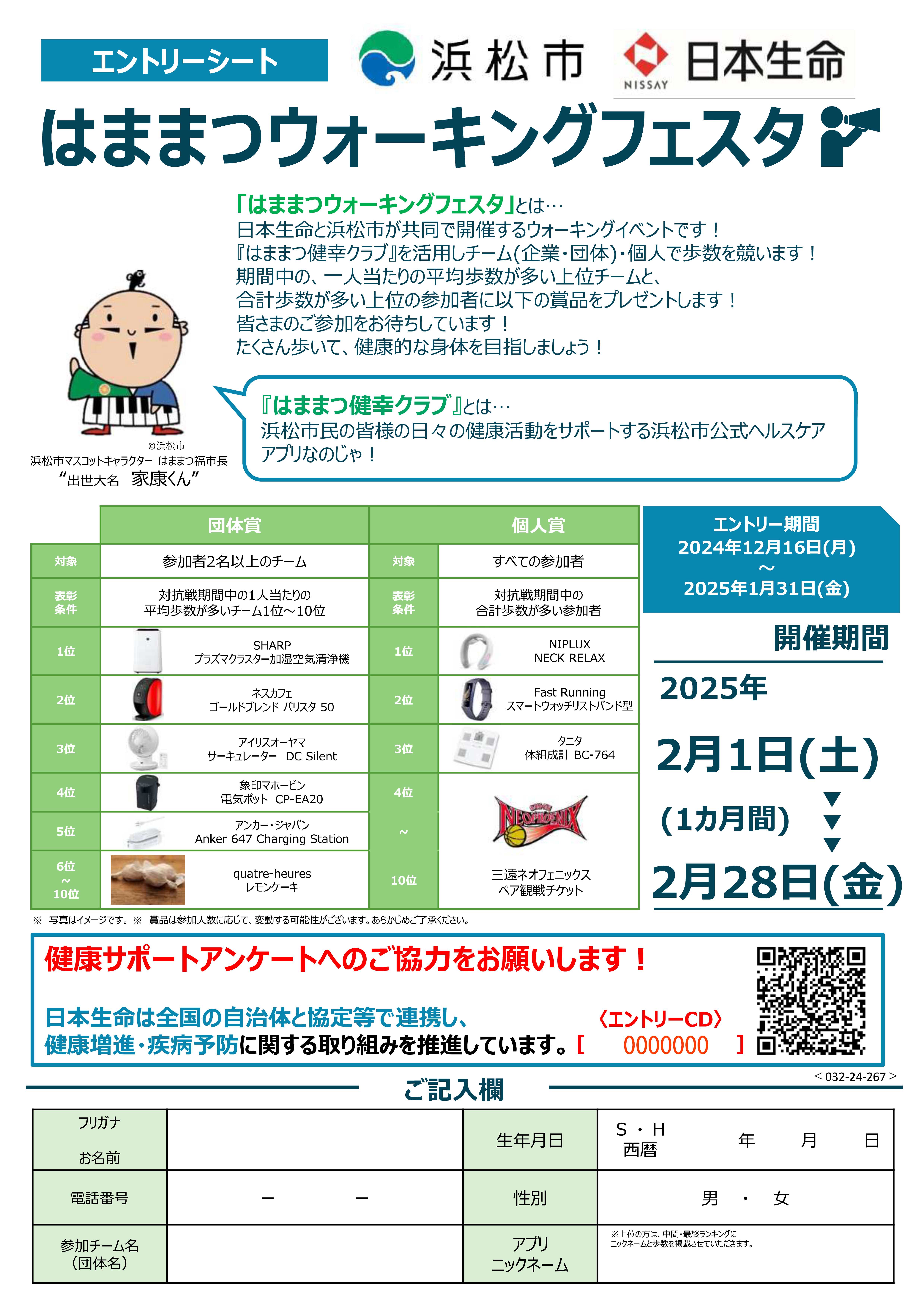 市公式ヘルスケアアプリ「はままつ健幸クラブ」を活用し、チーム(企業・団体)・個人で歩数を競います。