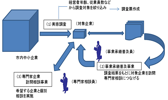 事業承継実態調査により事業承継の準備が必要と思われる企業を抽出し、事業承継普及員等が普及啓発を行い、専門家による企業への訪問相談等につなげる。