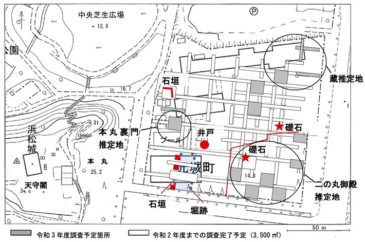 かつての浜松城二の丸などが存在した元城小学校跡地について、令和2年度の遺構調査結果を基にした詳細調査を行う。