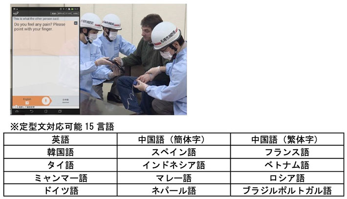 救急現場における外国人対応について、現在の外国語カード(6言語の救急定型文)から、ICT化による31言語通訳及び15言語定型文となり、救急現場対応が向上。