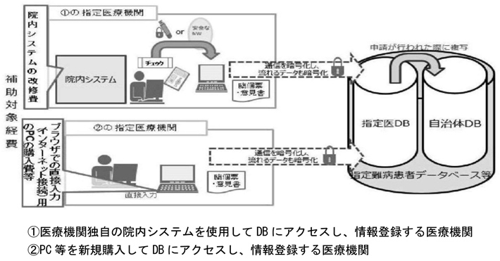 小児慢性特定疾病及び指定難病にかかる医療機関等において、厚労省のデータベースに接続するためのシステム改修及び機器購入経費を支援することにより、オンライン登録の推進及び事務負担の軽減を図る。