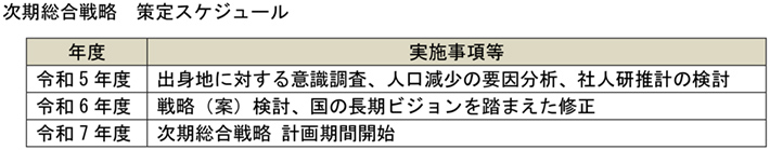 - 本市では、現行の総合戦略が終期を迎える令和6年度に、次期総合戦略の策定と人口ビジョン改訂の予定である。