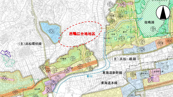 西鴨江台地地区において、土地区画整理組合の発足と併せ、公共施設整備により地域の活力を創出する新たな産業立地を創出し、良好な工業・流通業務等の土地利用を図る。
