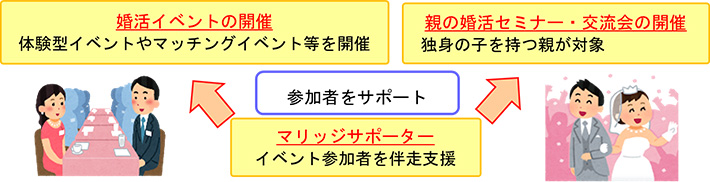 出会いの機会から結婚に至るまでの過程において、マリッジサポーターがイベント参加者のフォロー及びイベント終了後の相談に応じる。