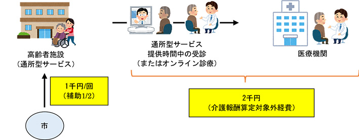 高齢者施設が実施する通所型サービスの提供時間中に、利用者が医療機関を受診した場合の施設への補助を実施する。