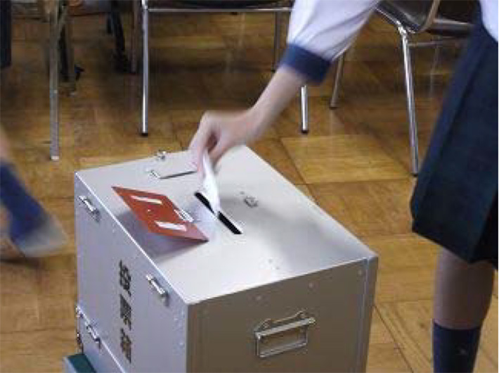 模擬投票を含めた出前講座を実施し、選管事務局職員の講義に加え、模擬投票では、生徒が実際の選挙と同じ投票箱、投票記載台等を使用し、投票の方法等を学ぶ。