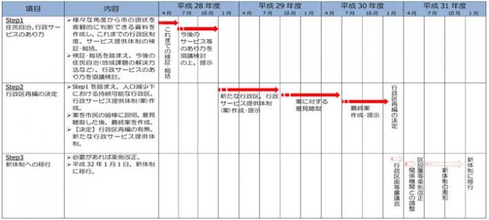 - 市議会での議論を経て、平成28年3月に「区制度検討に係る工程表」を策定した