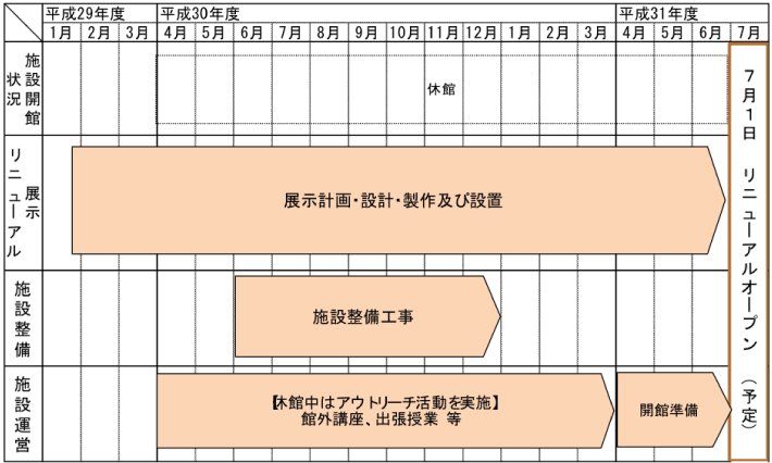 - 民間手法の導入と民間企業の協力により、展示リニューアルを実施し、平成31年7月1日にリニューアルオープン予定。