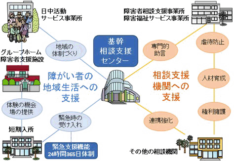 障害者の専門的な相談支援体制を整えるとともに、地域生活支援拠点事業により障害者の地域生活や緊急時対応を支援する。