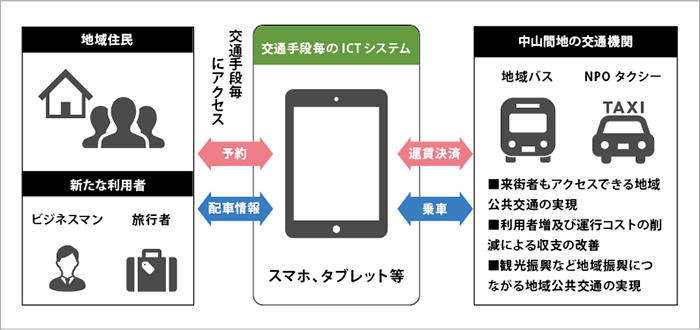 公共交通空白地において運行している地域バス及びNPOタクシーについて、効率的な運行体制の再構築、利便性の向上による地域住民の利用促進、並びに観光客を含む来街者の交通利用環境の向上を図るため、ICTシステムを活用した実証運行事業を実施する。